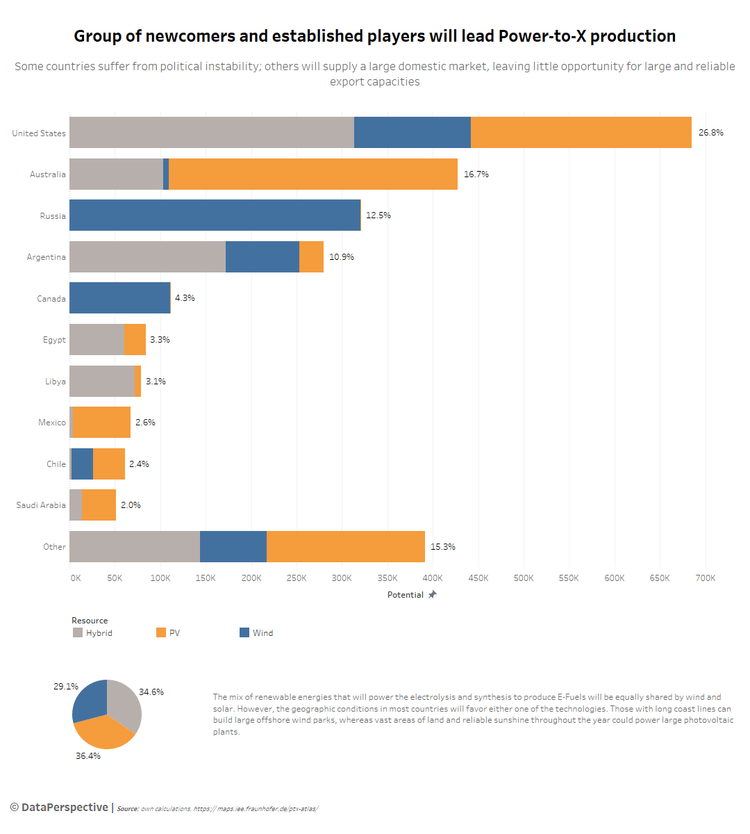 fuels because the potential is substantial. It is rather the dynamic of developing that potential in time that could create the competition between using the available energy for either Power-to-X production or the domestic energy grid. Aside from the renewable energy potential, the study considers other requirements like water availability for the electrolysis and socio-economic factors. Based on those factors, the study finds that the United States, Australia, Canada, Argentina and Chile show great potential to become important future suppliers of Power-to-X.[6] The political situation and the investment environment in countries like Russia, Egypt or Libya certainly plays an important role in this assessment as well. The case of Mexico is interesting because it has great potential for renewable energies and, as we will see below, has added renewable energy capacity more recently. However, the government under President Lopez Obrador has started to take control of the energy sector under the pretext of energy security. Part of that strategy sees a public push for the development of new fossil fuel-powered plants and an actively blocking the approval of permits for renewable energy projects.[7]